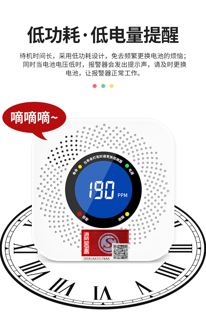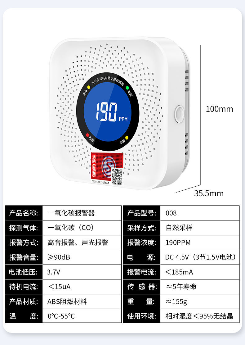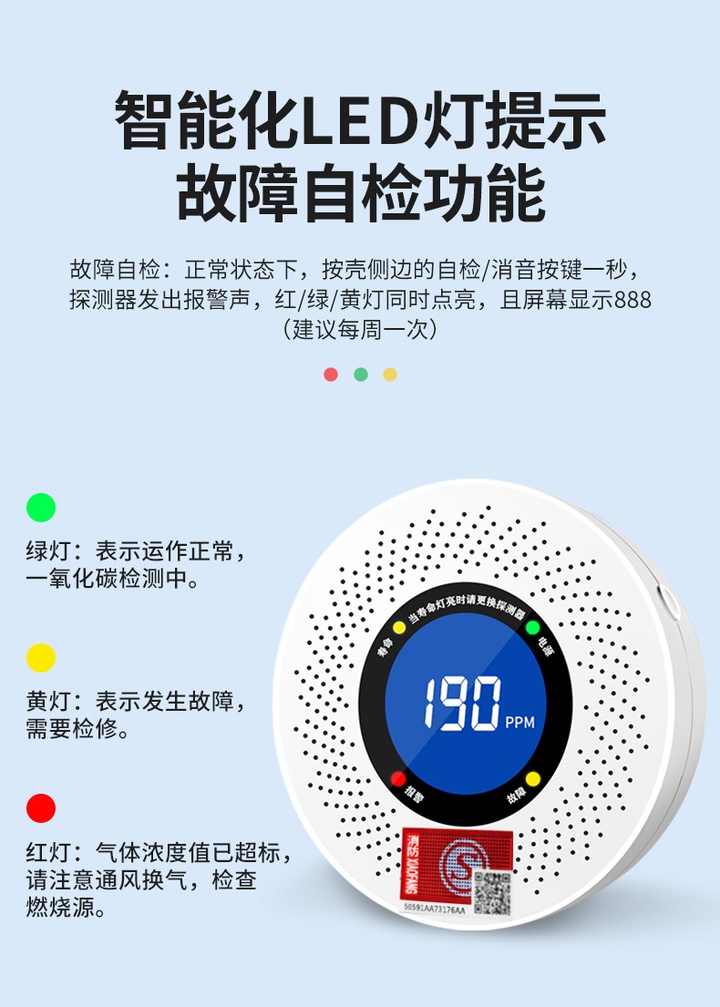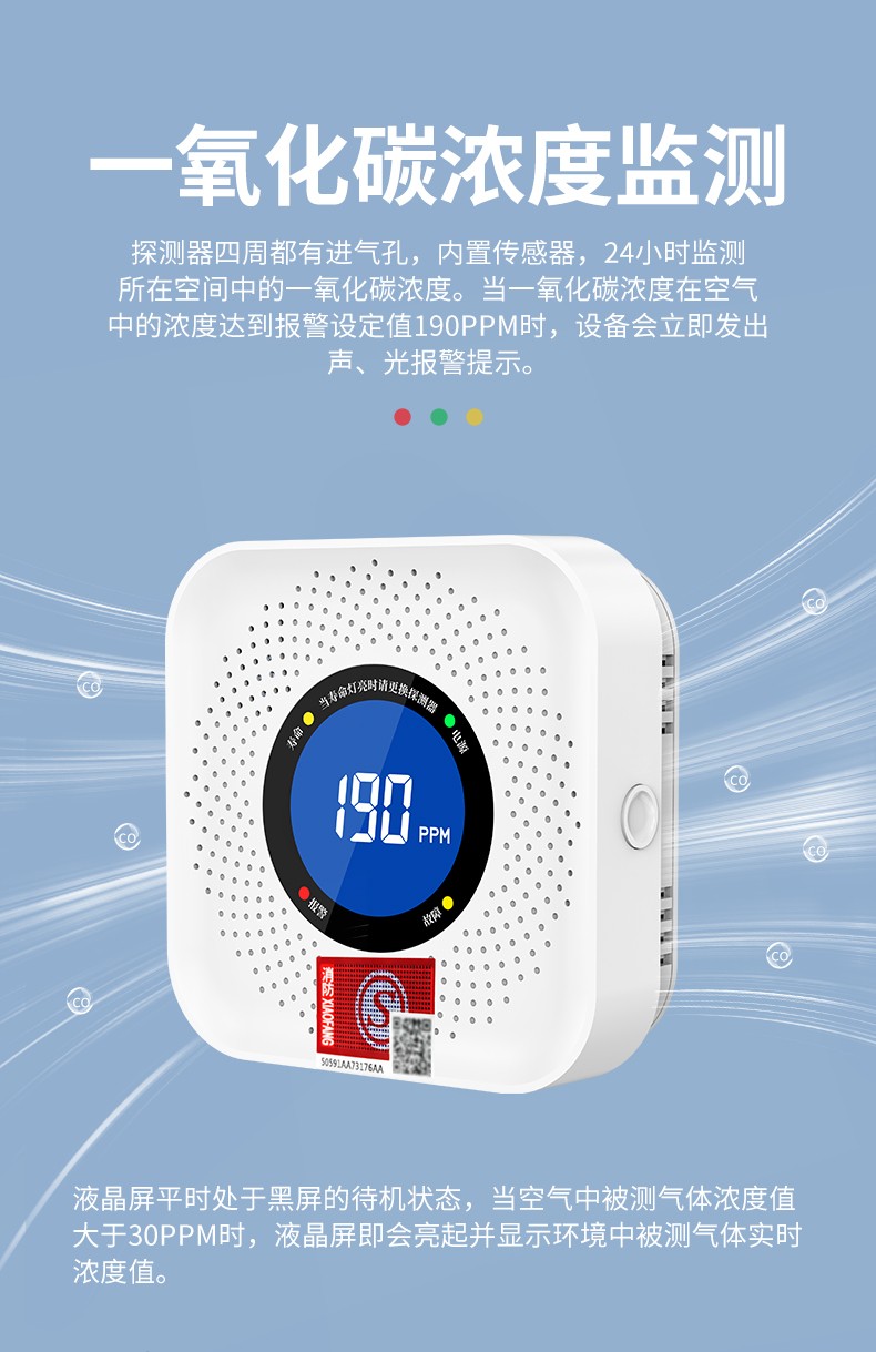 一氧化碳報警器(型號PA-008) 產品規格 功能特點 資料下載 一氧化碳報警器(型號PA-008)檢測氣體、燒煤、燒柴、燒炭、蜂窩媒、露營封閉環境、封閉車內85分貝報警音量.LED液晶屏幕顯示故障自檢: 綠燈(正常)、黃燈 (故障、需要檢修) 紅燈(氣體濃度超標) 5.報警方式:蜂鳴聲提示 6. 產品保險:1000萬承險 7. ABS阻燃材質適用場景:適用于廚房、浴室、起居室、火鍋包廂、飯堂等長時間空氣不流通的場所安裝一氧化碳報警探測器