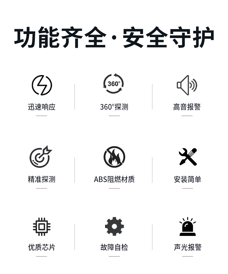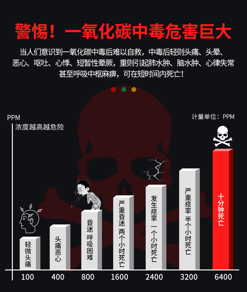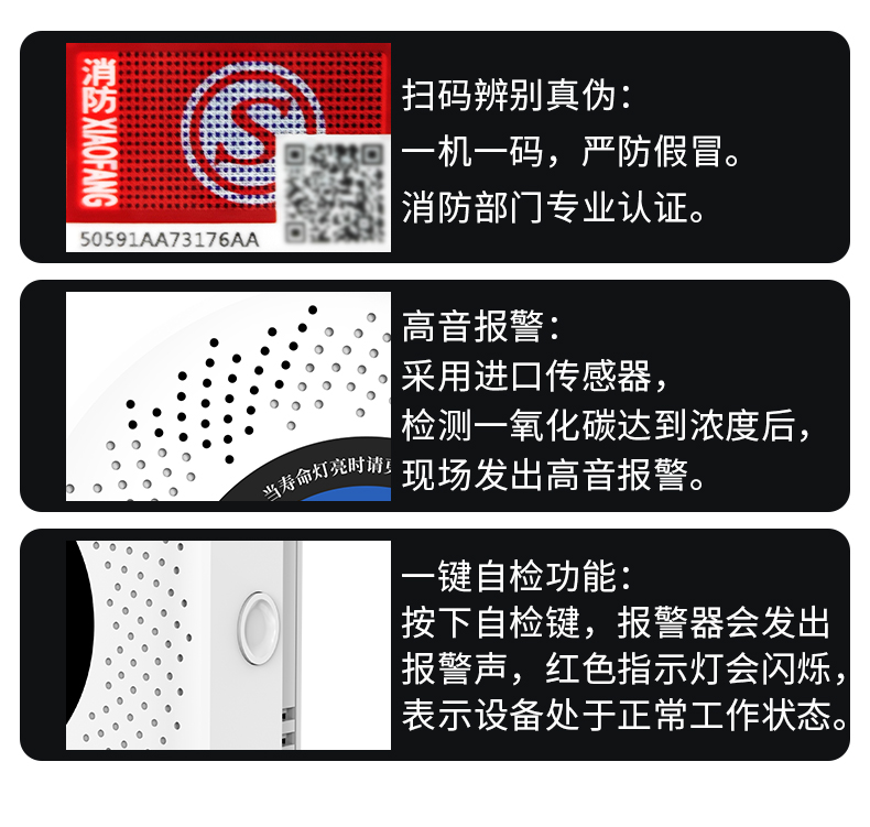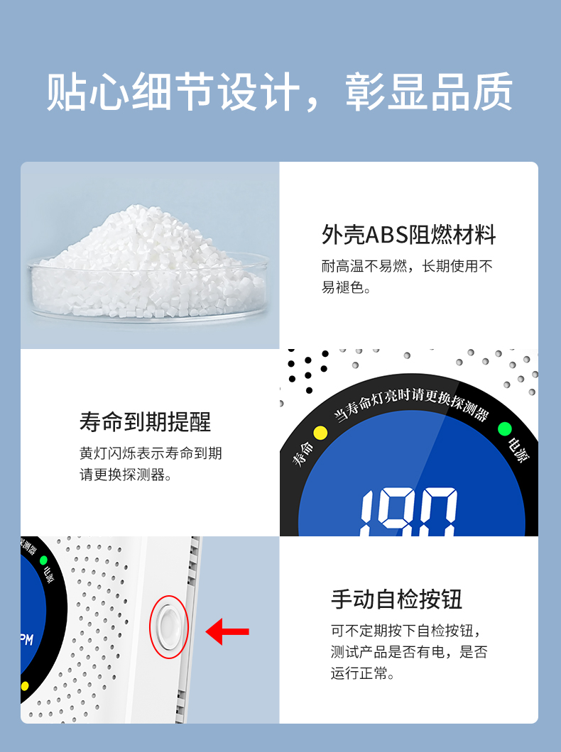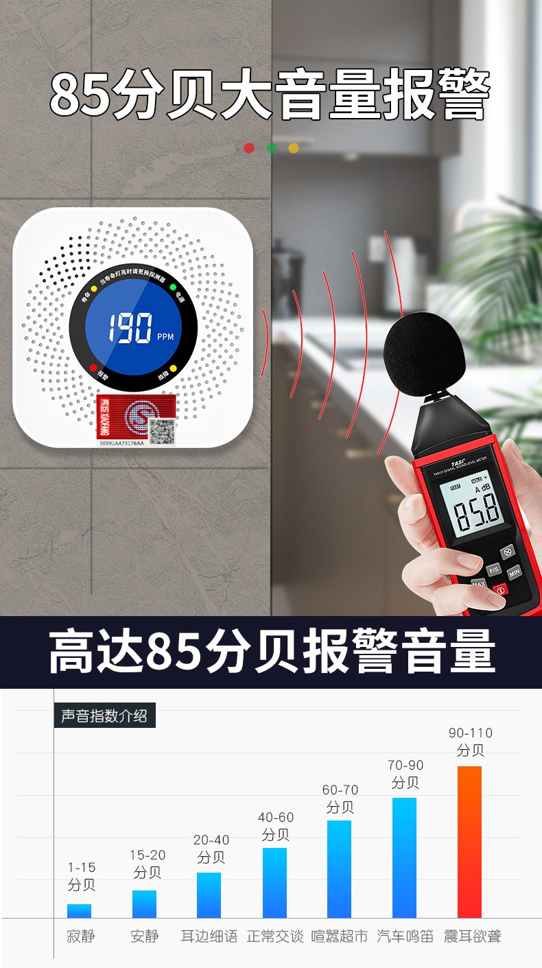 一氧化碳報警器(型號PA-008) 產品規格 功能特點 資料下載 一氧化碳報警器(型號PA-008)檢測氣體、燒煤、燒柴、燒炭、蜂窩媒、露營封閉環境、封閉車內85分貝報警音量.LED液晶屏幕顯示故障自檢: 綠燈(正常)、黃燈 (故障、需要檢修) 紅燈(氣體濃度超標) 5.報警方式:蜂鳴聲提示 6. 產品保險:1000萬承險 7. ABS阻燃材質適用場景:適用于廚房、浴室、起居室、火鍋包廂、飯堂等長時間空氣不流通的場所安裝一氧化碳報警探測器