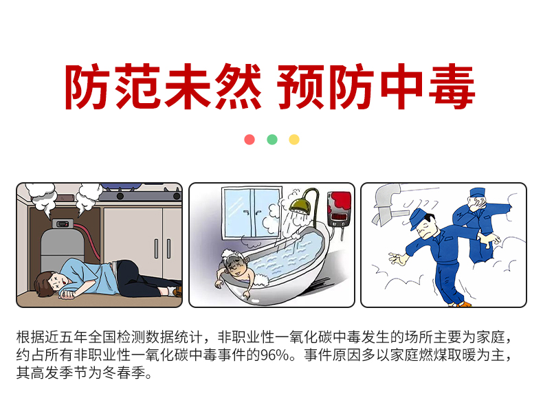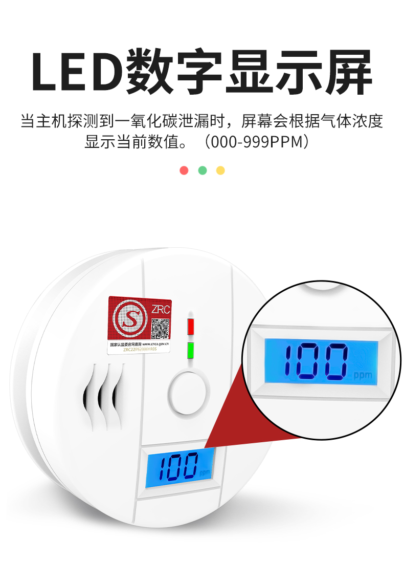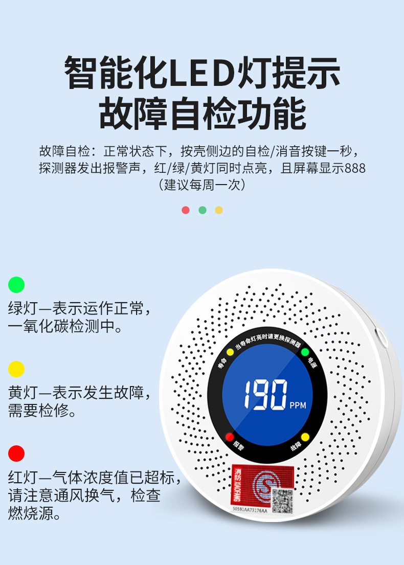 一氧化碳報警器(型號PA-009) 產品規格 功能特點 資料下載 一氧化碳報警器(型號PA-009)1.檢測氣體、燒煤、燒柴、燒炭、蜂窩媒、露營封閉環境、封閉車內2.85分貝報警音量3..LED液晶屏幕顯示4.故障自檢: 綠燈(正常)、黃燈 (故障、需要檢修) 紅燈(氣體濃度超標)5.報警方式:蜂鳴聲提示 6. 產品保險:1000萬承險7. ABS阻燃材質適用場景:適用于廚房、浴室、起居室、火鍋包廂、飯堂等長時間空氣不流通的場所安裝一氧化碳報警探測器