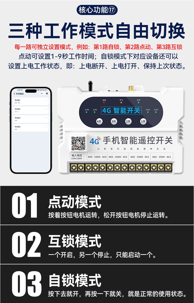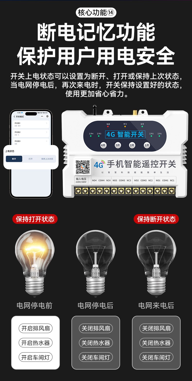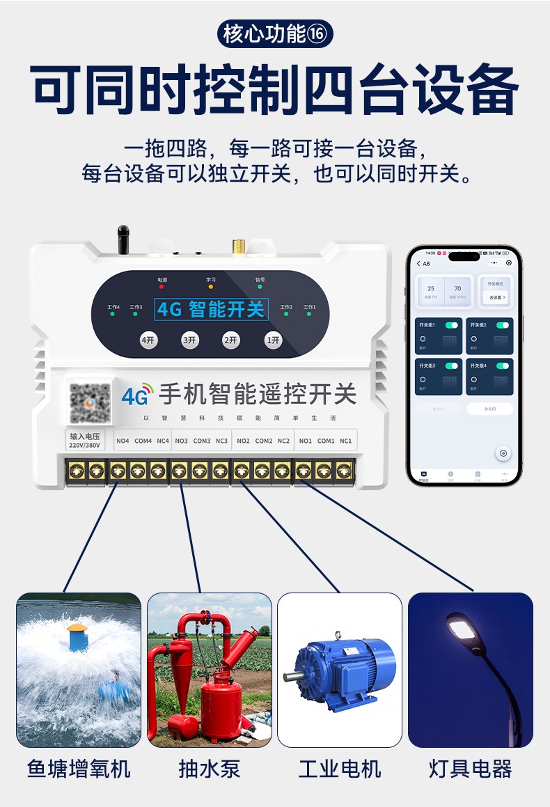 4G遠(yuǎn)程控制開關(guān)(YS-A8) 產(chǎn)品規(guī)格 功能特點(diǎn) 資料下載 4G遠(yuǎn)程控制開關(guān)(YS-A8)無需流量、無需插卡 、無需WIFI手機(jī)小程序控制定時開關(guān):云端定時 、本地定時、 倒計時多人控制斷電提醒 +信息推送狀態(tài)檢測三種工作模式自動切換:點(diǎn)動模式 、互鎖模式 、自鎖模式工作電壓: 220v/380v (可選)應(yīng)用場景:正反轉(zhuǎn)、水泵、啟動柜、變頻器 、魚塘增氧機(jī)、抽水泵、工業(yè)電機(jī)、燈具電器等