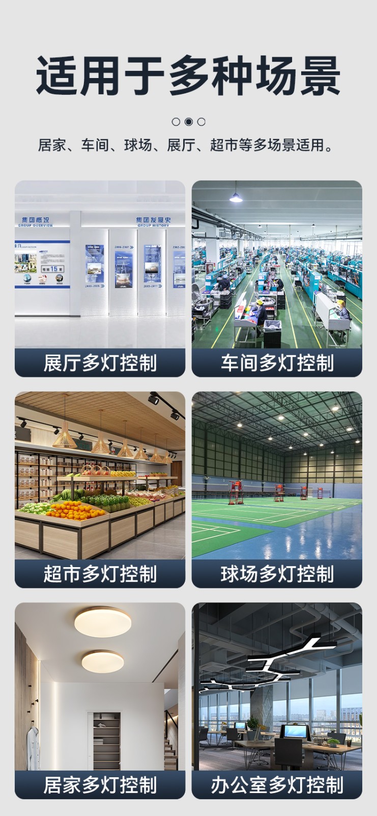 8. 應(yīng)用場景: 展廳多燈控制、車間多燈控制、超市多燈控制、球場多燈控制、居家多燈控制、辦公室多燈控制等